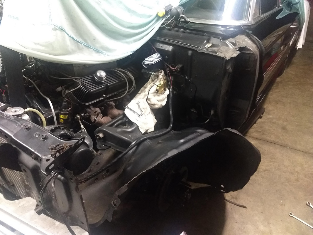 I got the master cylinder bled and the lines attached. I seem to have a leaker on the PV? Going to have to pull that little line and inspect the flare. I'm going to get everything bled up before I go through all the work of getting the front end back on. I'm not pulling all this crap again!! I only knicked the edge of the door a couple times getting the fender out. Glad it's black and easy to dab some touch up on the corner. Not the first time it's gotten some rash on it during the last 22 yrs since it was painted.