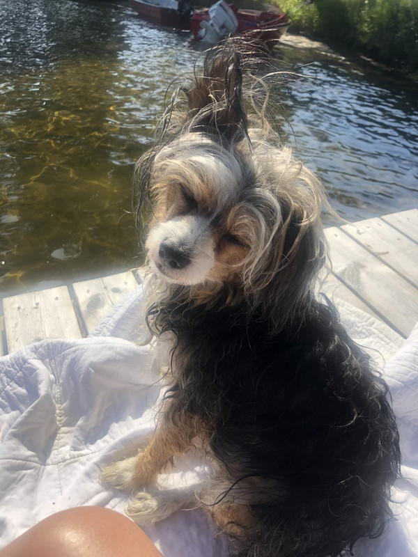 The dog enjoying the sun after her bath
