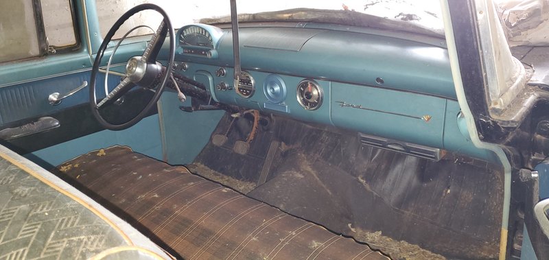 Spent the last week pulling this out of a barn. '55 Customline 2dr, 272 3spd with overdrive. It had sat in there for about 35 years. So long that the barn had settled enough that I had to use a chainsaw to cut the bottoms of the doors off to get them open. Groundhogs had sunk the floor, but the car was originally sitting on thick oak planks....which had all but rotted away. Since it was sunk pretty good, and all 4 tires were flat, I was pretty worried about the floors and frame, but I was utterly amazed at what I found. You'll see in the pictures below.