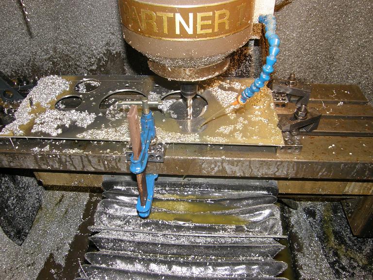 Two years ago, I would have been printing out a full size copy of this drawing, taping the pages together, and using it to trace out the locations of all the holes in the panel and the general outline onto my 1/8" aluminum panel. But now with the CNC machine available it was just a matter of fixturing the panel material on the table, and programming the machine to do the work. I think it actually would have been faster if I had done this manually, but the quality of the job is so much better with the CNC mill that it was really a no brainer to use that. Programming the panel and the split ring to go around the steering column took a while, but by 11:00 AM I had the split ring machined. It took me a half hour or so to pull the vise off the CNC machine and fixture the aluminum panel for the instrument cluster on the table, but shortly after 11:30 I started the CNC program. Here's a photo of the partially cut instrument panel being machined: