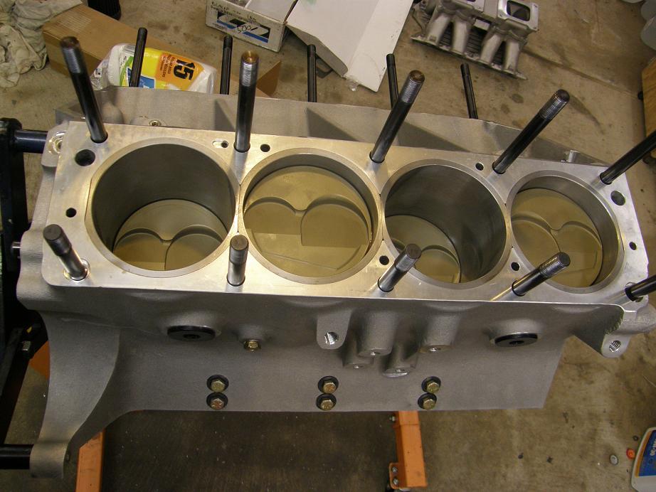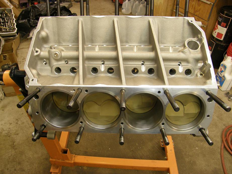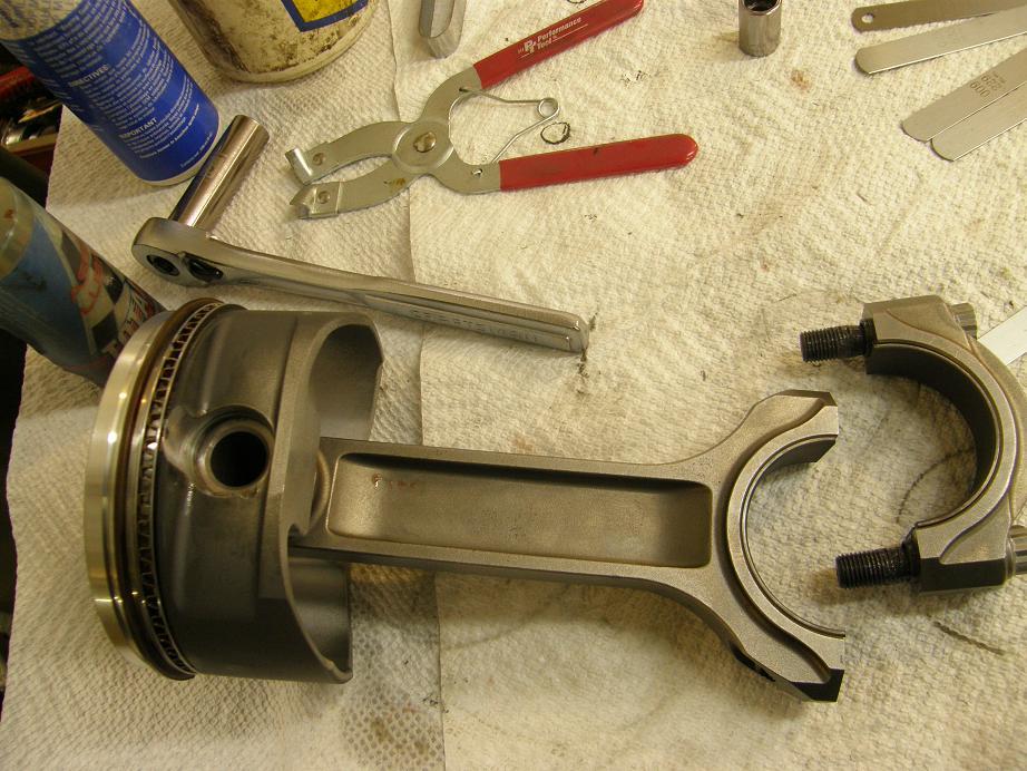 Finally got back to the high riser project this weekend, after getting the Galaxie back together (replaced the flywheel with an ATI unit). Re-starting from scratch, I assembled the short block over the weekend. All the clearances looked good, and things went along pretty well with one exception. This is the first time I've assembled a short block with Dykes rings, and on the first piston I tried to go a little too fast, jammed the top ring between the tapered ring compressor and the piston, and put a bend in the top ring. After that I was more careful, and got seven of the pistons and rod assemblies installed with no further problems. I'll call in the order for a replacement top ring tomorrow, and hopefully will have that by the end of the week. In the meantime, there's a lot of other things I can be doing, such as assembling the heads, finish welding up the oil pan, install the cam and Danny Bee belt drive, finish machining the oil pump and alternator brackets, etc. etc. I'm hopeful that by next weekend the engine will be all together, save for some of the plumbing and accessories, so I'll be ready to dyno it at the end of this month. Here's some photos of the short block and a piston/rod assembly: