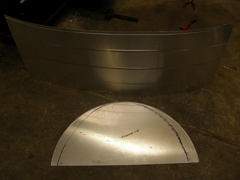 My first thought was to cut the half moon shaped piece of the wheel tub to match the contour of the factory wheelhouse, and then bend the side over so it would look like the original piece, and slide it into the groove in the flat part of the wheel tub. Here's a photo of the two wheel tub pieces, with one of the contours marked on the half moon shaped piece: