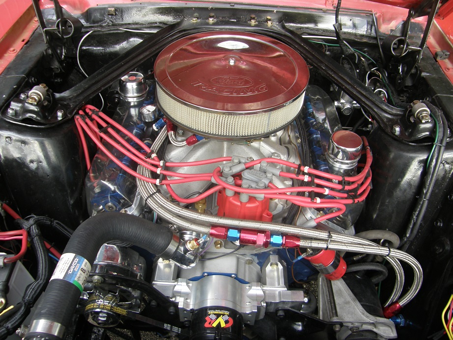 I'm also very pleased with the stance of the car, and the handling. Despite the drag race oriented shocks, it is flat around corners and handles varied road surfaces quite well. If anything, I think it is a little too low, but it doesn't seem to hit the exhaust or anything else over bumps, so I think I will leave it as is. That Shelby drop and the big front sway bar sure made a difference in handling; this car never handled that well before. It has the usual no-feel, factory leak option Mustang power steering, but I guess I'm used to that and don't find it objectionable. Here's a couple of pictures of the car as it is today: