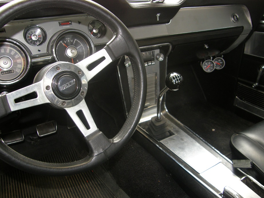 The transmission is a dream. It shifts so easily and effortlessly, and the gears are easy to find and right where you expect them to be. With 4.11 gears, the car is at 2500 RPM at 75 MPH in sixth, so long road trips are no problem. I've never had a manual transmission that works this well, not even a toploader. The only gripe I had on the first drive was that the shifter handle that came with the kit positioned the shifter too far over towards the driver; I'd hit my knee with the shift knob when going to second gear. I fixed that later by putting the shift lever in my vise and bending it over a couple of inches; now it is perfectly positioned. Here's an interior picture of the car; sure like that six speed pattern on the shift knob...