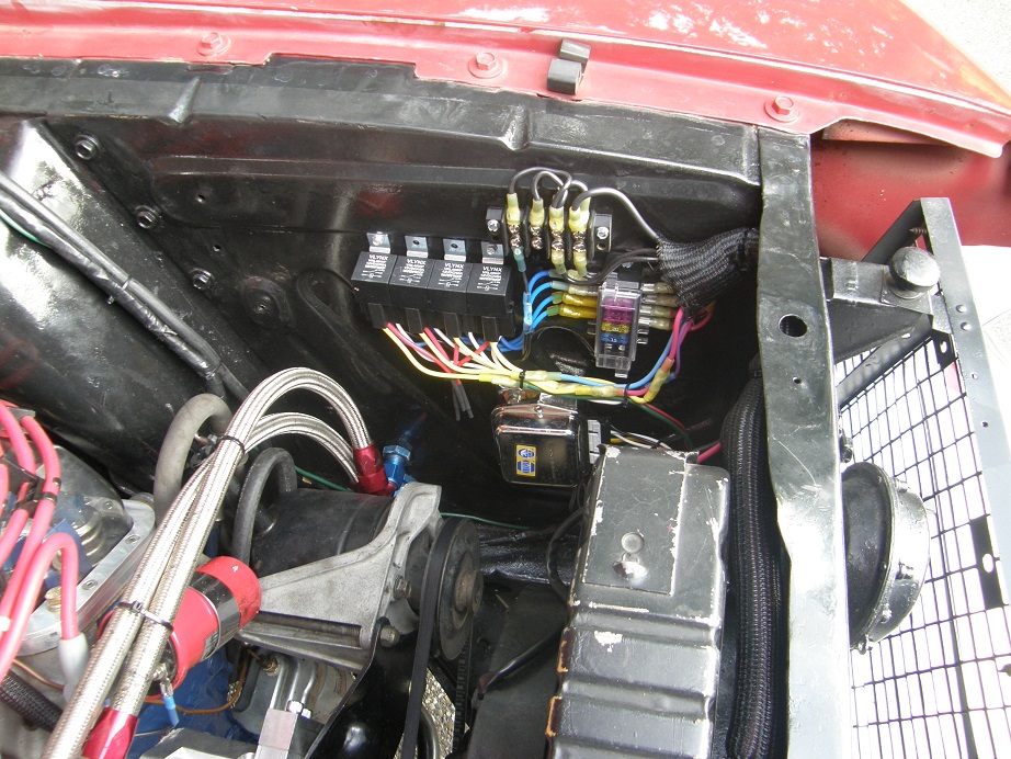 So, I had one distributor with a working pickup and only 7 tangs on the reluctor, and another distributor with a bad pickup. I spent the next 45 minutes or so extracting the good pickup from the old distributor, and installing it in the new distributor. I also tested the bad pickup, and it came in at 640 Ohms, which would indicate that it should work. Go figure. FINALLY, after the distributor installation the engine fired up and sounded just fine. Here's a picture of the engine compartment, and also one of the wiring on the fenderwell that runs that electric fans, electric water pump, and electric fuel pump: