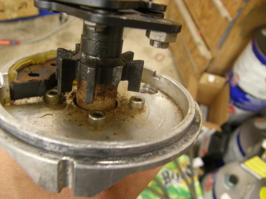 Now the engine fired and at least there was no fuel dripping into the engine unmetered; it sounded quite a bit better. But, it was still obviously missing. I checked the timing and it looked OK, and I thought maybe I had a bad plug or something. I popped the distributor cap to make sure the rotor looked OK, and it did, but sitting inside the distributor was a 3/8-16 nut. How did that get in there? Maybe I had the cap off when the engine came off the dyno and the nut dropped in without me noticing it? That's the only thing I could think of. I took a closer look at the distributor, and saw this: