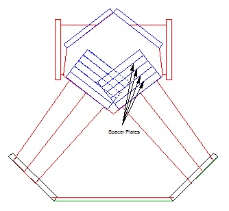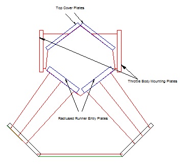 Runner length is now 12", and the runners are starting to take up some room in the plenum. Further, there is only a couple inches of plenum area over the runners, which is a concern. So, adding spacers to the flat plates at the top of the manifold will restore some room over the top of the runners, and add plenum volume, as shown in the drawing below: