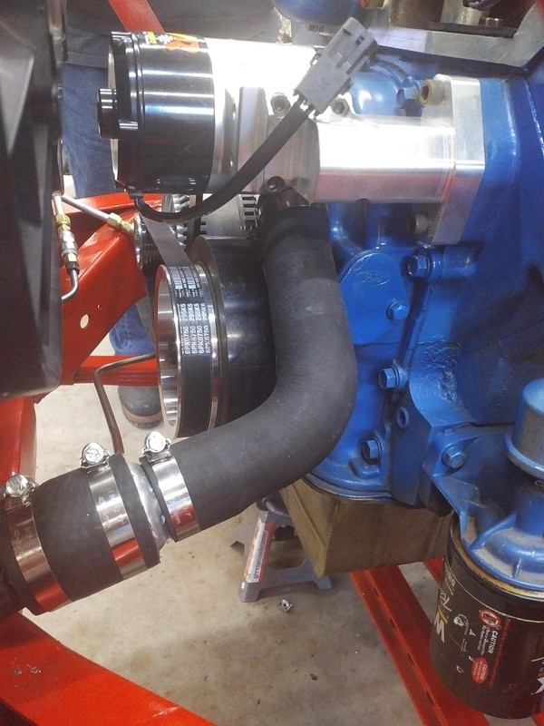 I finally got some time off from work. While I was away, dad has been busy. He put the front clip back on along with the radiator and built a cool little shroud with a couple of cooling fans. The fans came from a mid 90's Taurus. Hopefully they move plenty of air.
