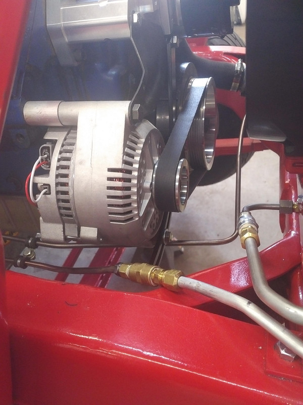 I picked up a 3G alternator for a 95' Mustang at my local NAPA. It's a 135 amp large frame variety. To convert it to a true one wire alternator I found a conversion voltage regulator on eBay. I also clocked the output post around to a more suitable location. Easy peasy. The crank pulley is a March 7611. It's for a BB Chevrolet so it took some whittling. The lower arm is a Summit G4049B universal alternator arm. I had to cut a few inches off and drill a new hole in it. The belt is a Dayco 5060295 6 rib belt. Credit to Jay for passing along these part numbers to me. It turned out to be a pretty slick alternator assembly.