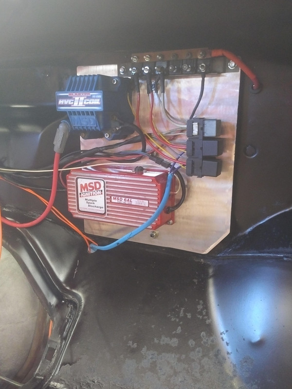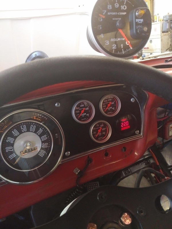 Dad assembled a slick little panel for the ignition components with breakers and relays for fans, water pump and fuel pump. He pulled the breakers and relays out of an old Freightliner in his boneyard. Dads ability to make chicken salad out of chicken shit always surprises me.  I took some 18ga plate and made inserts for the stock instrument panel so we could mount switches and gauges.