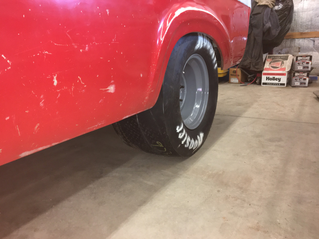 One of the big issues we had at the track last season was traction. I went with M/T DOT drag radials because several acquaintances liked them. They all have much lighter cars so maybe they work better for that application. They don't like a heavy truck. They did work better for us with a well prepped starting line. But still shook the truck. So after much measuring and discussion, we ended up with a 30.5x13.5 Hoosier bias slick with a stiff sidewall. Hoosier lists this tire as a 29.5x11.5W. It seems odd not being able to look at the tire to see what size it is. Anyhow, we also had a pair of custom 12" wheels made. We didn't want to radius the bedsides so it took some back spacing.