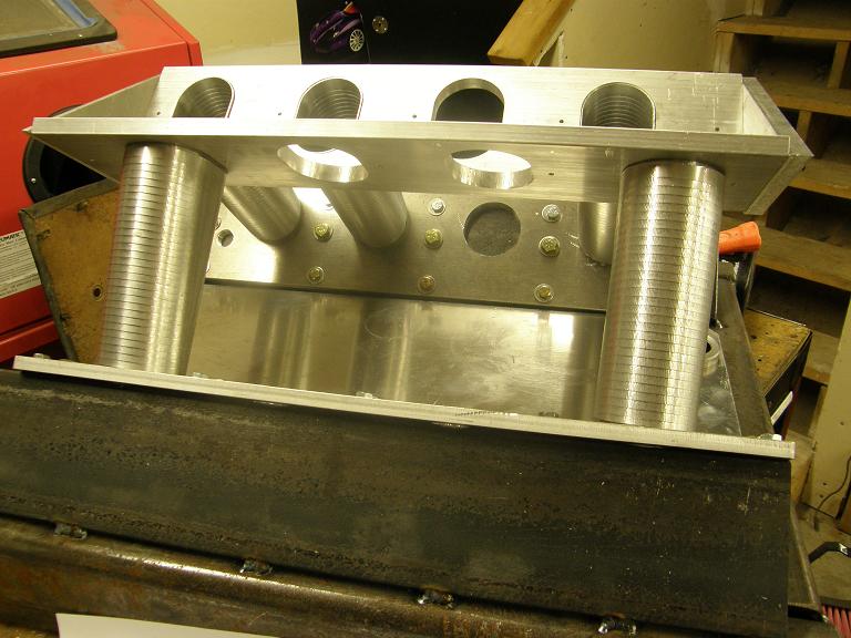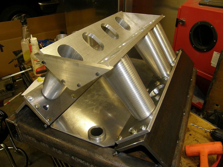 After some family activities on Sunday morning (Easter Sunday), I got out to the shop Sunday just before noon and started programming the CNC machine to cut the bottom plenum plates for the intake. I figured I could get those cut out, and at least assemble the intake with five of the completed runners in place to see how everything looked together. While the CNC ran I used the bandsaw to cut some other aluminum pieces I would need for the manifold later. At 3:00 I checked my email and found I had a bunch more books to ship, so I took care of that and then went back to program the CNC for the next couple pieces. Around 6:30 I went in for dinner, and then was back out in the shop tonight for a couple hours trimming and fitting the manifold pieces and assembling the parts. Here's a couple of photos of the intake as it sits now: