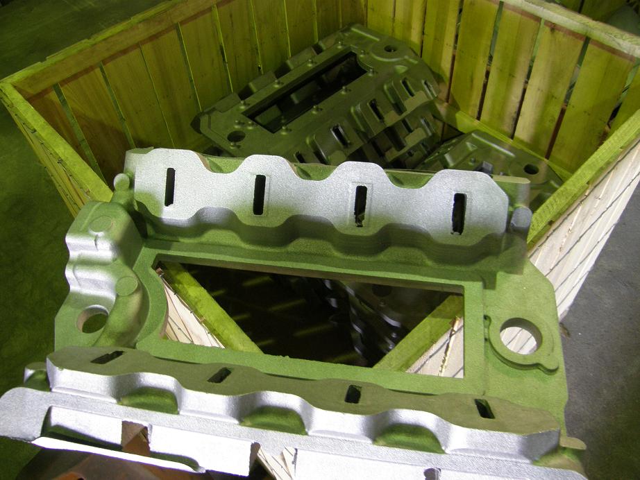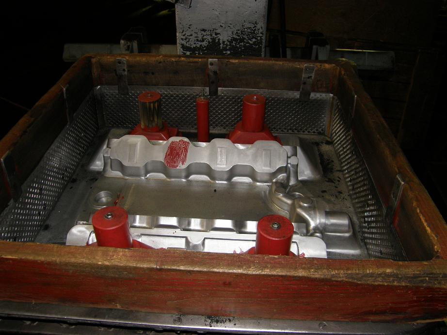 After they cool completely the castings are trimmed to remove the excess aluminum, and put in a box to get ready for shipment to the heat treat plant.  Here's a box of the castings, with one on top so that you can get a better idea of what they look like at this stage: