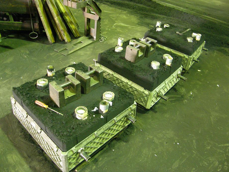 50 castings! Thats cool! What are the big honking weights doing on top of the sand? Trying to control the adaptors from warping up while cooling? Or are they soaking up heat?