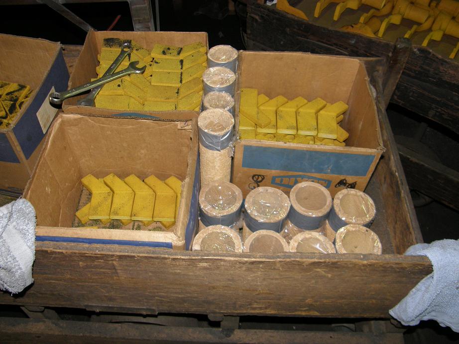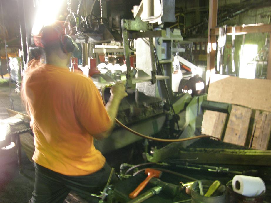 As usual things are slightly behind schedule on this project, but today I was able to run off at my lunch break and watch the action at the foundry.  What an education!  It was really cool watching the guys in the foundry put together the sand molds for the manifolds and cast them.  I only had about a half hour to watch, but they did one for me from start to finish so I could take a bunch of pictures.  Unfortunately, the battery in my camera got weak after a few shots and I had to discontinue using the flash.  The foundry is kind of dark inside, not the ideal environment for photos, and so after the flash went out the exposure times got long, and some of the following shots are blurry, with kind of a greenish cast to them.  Figures that the camera picked today to run out of juice; oh well.  You guys will get the idea from the photos below.