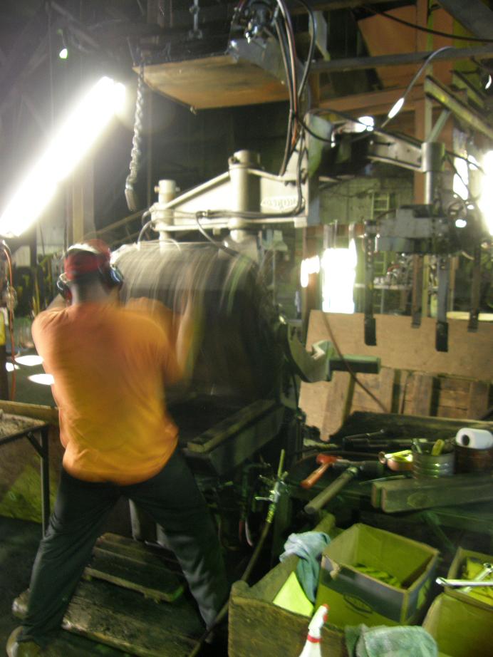 After the ramming process is finished the match plate and flask assembly is rotated 180 degrees on the Roto-Lift machine, so that now the top side of the match plate is facing up.  The picture below is one of those long exposure pictures, but you can see the blur of the assembly as Mario rotates it 180 degrees, and then with the top side of the match plate facing up: