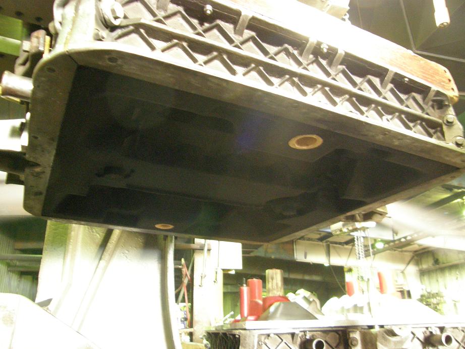 Here's a photo I took looking up underneath the top half of the sand mold.  You can see the impression in the sand from the match plate.  I believe they told me that there is about 500 pounds of sand used for each of these molds, so that is 250 pounds of sand hanging up there in the air, maintaining the shape of the match plate.  Unbelievable...