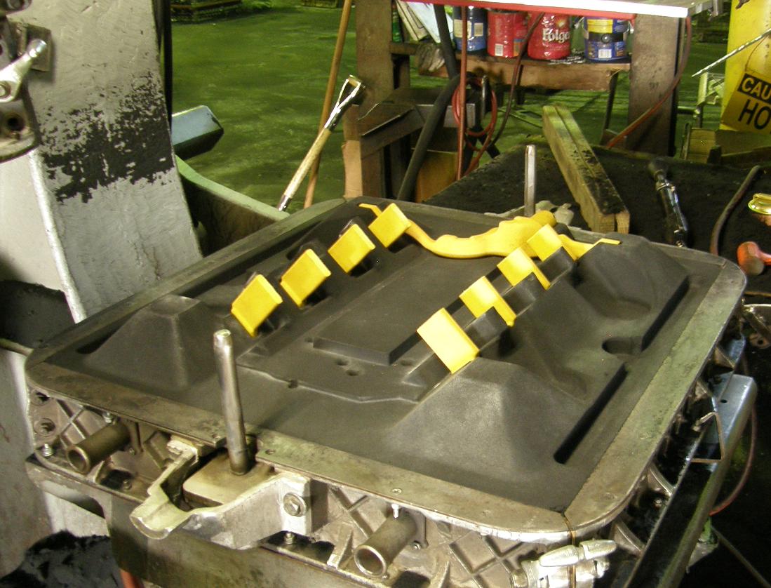 Here is a photo of the match plate, installed between two boxes to contain the sand.  I think the boxes are referred to as flasks, or maybe as a cope and a drag, in foundry parlance.  This assembly is positioned on the Roto-Lift machine so that the sand can be poured into the boxes and rammed in place.