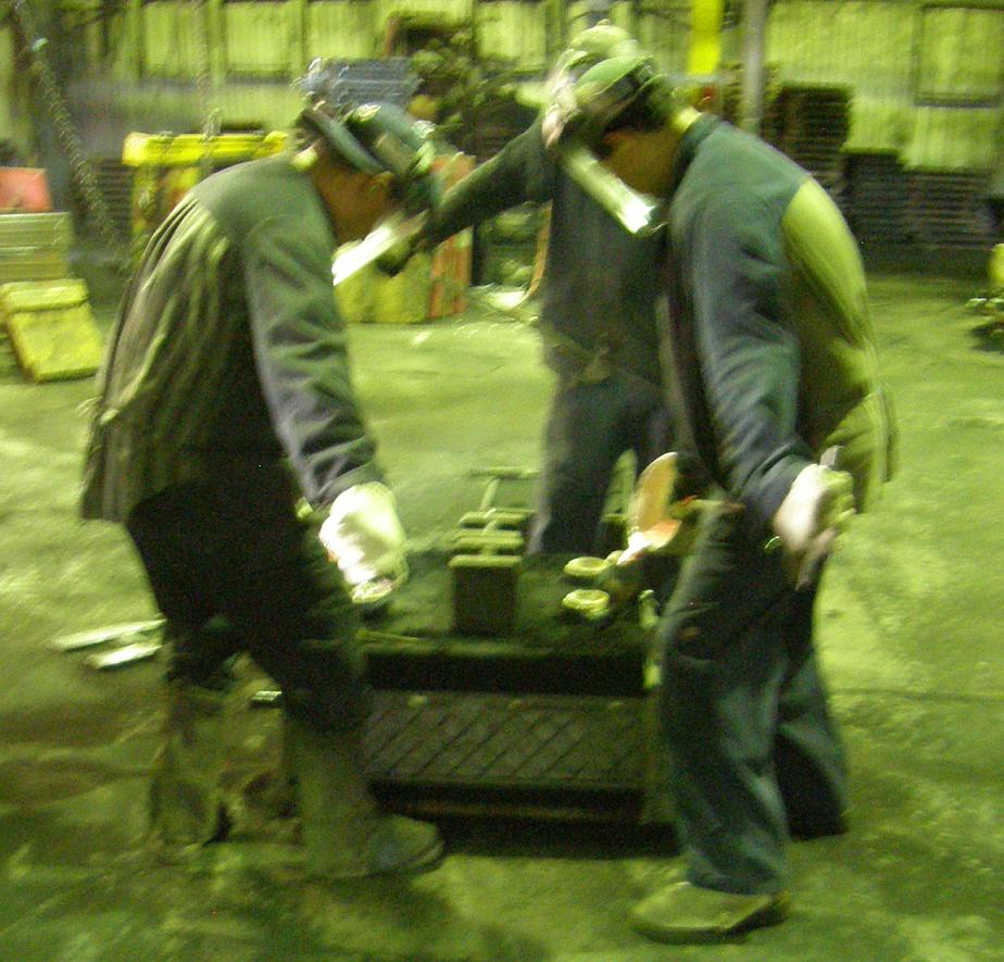 Next the two halves of the mold are put back together on the Roto-Lift machine, and then Mario uses a rotating crane with an electric lift to pick the whole mold assembly up and move it to the pouring area.  They use three operators pouring at once to fill the mold; I apologize for the very poor quality of this picture, but I'm sure you get the idea: