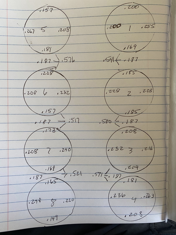 These are center of the barrel measurements. I took measurements then filed the head to fit the cylinder arc and measured again. The measurements got smaller and more stable. I then used the 3/16 drill bit size (.1875) that I was able to fit between the cylinders to add to the adjoining cylinder walls and you see the end measurements in the middle.
