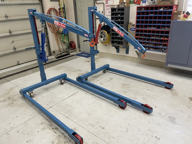 The pictured blue ones are we rent around here. Much better than the one I have which barely reaches the center of the engine on a 64 Fairlane which is a stubby front end compared to many. It's also rated 1/5th ton when extended and i've drilled a new hole to extend it a few inches more.  Problem is I have to stand on it with an FE hanging off it or it'll topple forward. Extending the legs to straddle larger wheels would solve that and also solve the small wheels not rolling on asphalt very well and it hitting the underside of the lower control arms unless I put the tires on blocks.