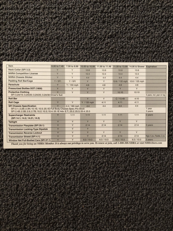 I agree with Mike, go to the NHRAracer.com website for access to the rulebook, not the regular NHRA page. They usually sell actual paper copies of the rulebook too, although I don’t see it offered on there at the moment, maybe because it’s so late in the year. They usually have actual copies of the rulebook for sale in the NHRA merchandise tent at national events too. NHRA does have a cheat sheet of sorts, I posted a couple example pictures below, although be aware, I’m sorry it’s 10 years old, so stuff like the helmet specs are out of date. I’ll have to look around to see if I have a newer version. I think they include these sometimes with the membership packs.