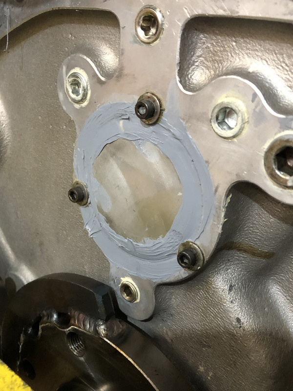 The re-boring meant that the diameter of the hole at the last cam journal was enlarged and the 'normal' cup plug was unusable. The solution was to use a plug intended for a 385-series engine. But a cup plug intended to go in 'backwards' comes with the flange shaped differently than the usual. The solution is to bore a hole in a piece of half-inch plate, so sized that the plug, when pushed through, comes out the other side properly shaped to be inserted into the FE block. And the Roush guys used two-part epoxy to make sure it wouldn't come out, just as they were doing on a weekly basis with the NASCAR engines.