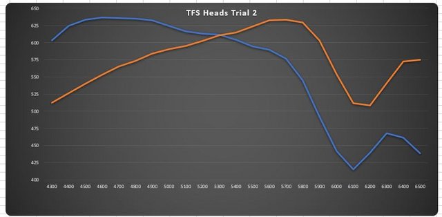 We have one head left to test and I'll post everything up in a big writeup, but the TFS bugs me because it makes for crappy data. The beginning of the curve looks very promising and it looks like it's going to outrun the two previously tested heads, then at 5900 it chokes. The trajectory shows that it's about to make 640-650hp, the other two heads made peak power between 6000-6100. If it carried out that far it'd be a strong running machine....... Maybe when we're done with this last set of heads we'll try the TFS with a different cam.