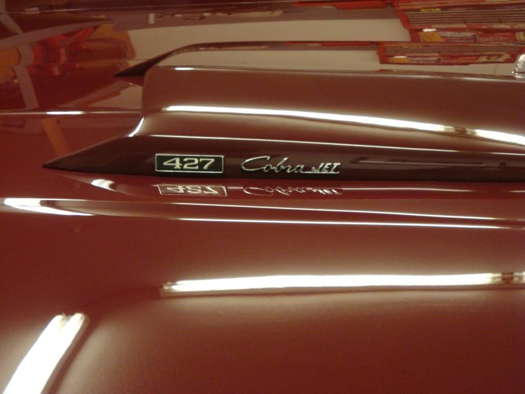 While I don't have the "Cobra Jet" script, I have the factory 427 emblem on my R-code Mach hood scoop. Used the Mach 1 scoop because of the dual 4 intake. It's gotten me a few "W" code comments....even though the dash plate clearly says "R".  :)