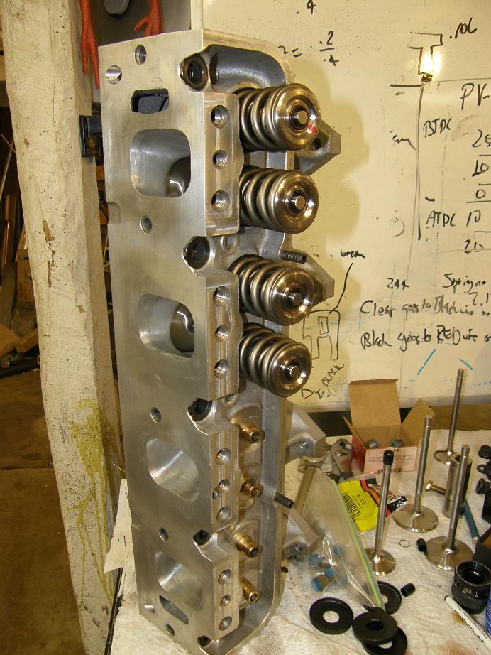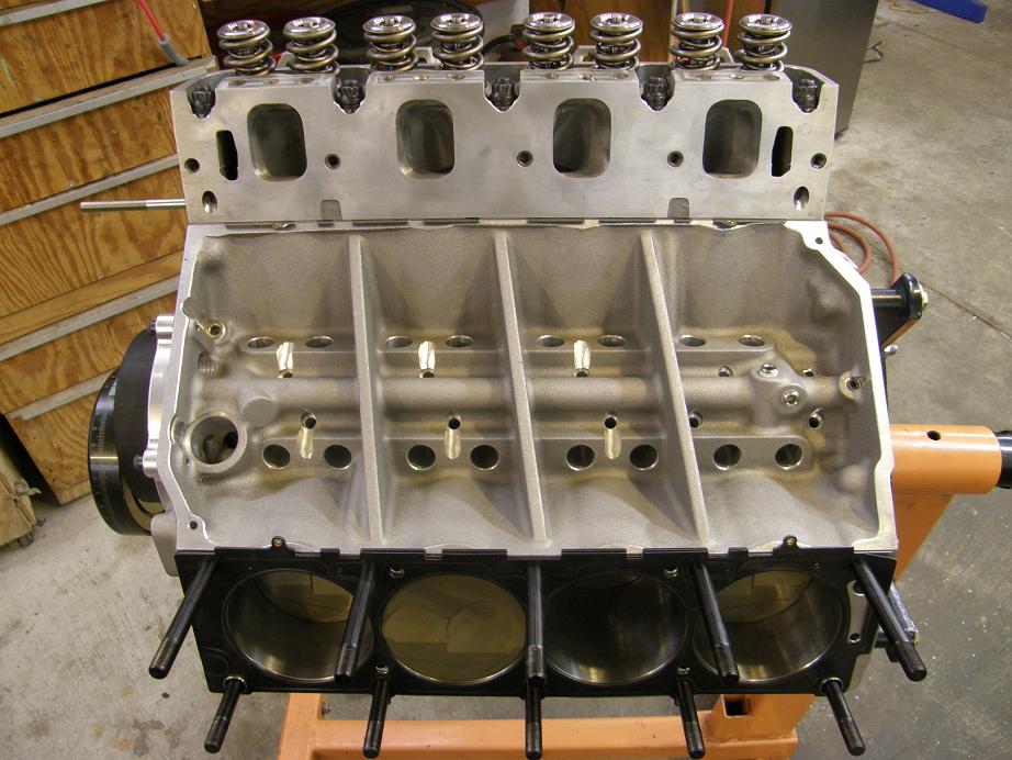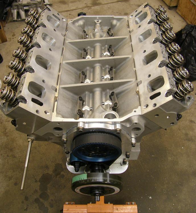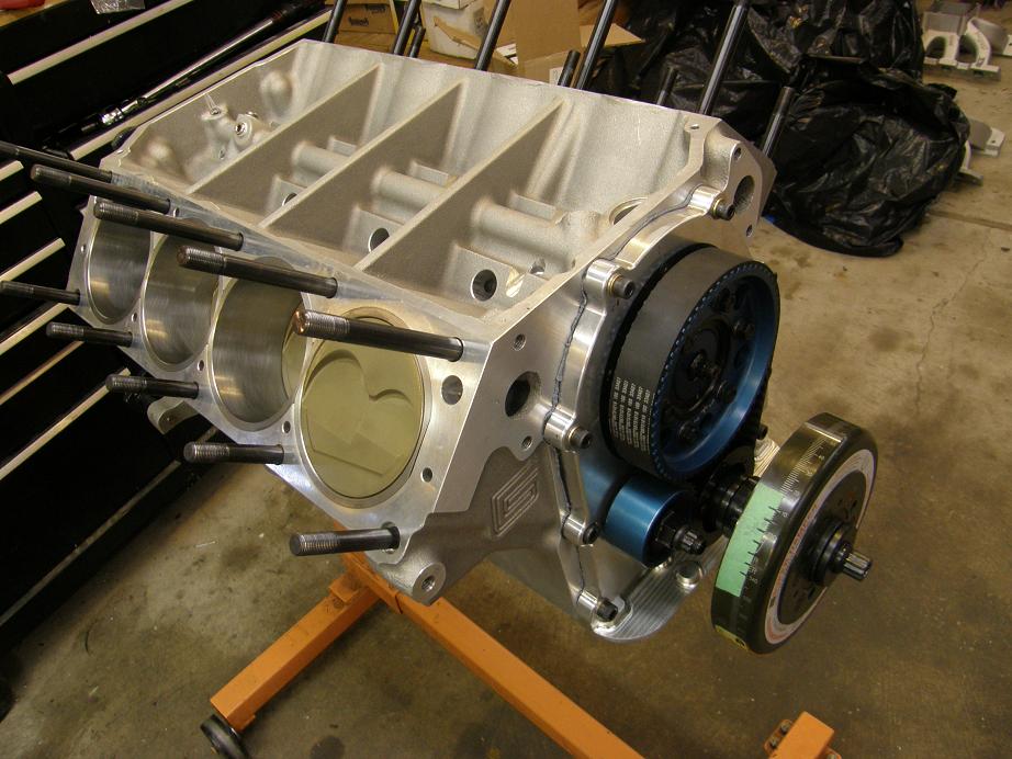 Finally got back to the high riser project this weekend, after getting the Galaxie back together (replaced the flywheel with an ATI unit). Re-starting from scratch, I assembled the short block over the weekend. All the clearances looked good, and things went along pretty well with one exception. This is the first time I've assembled a short block with Dykes rings, and on the first piston I tried to go a little too fast, jammed the top ring between the tapered ring compressor and the piston, and put a bend in the top ring. After that I was more careful, and got seven of the pistons and rod assemblies installed with no further problems. I'll call in the order for a replacement top ring tomorrow, and hopefully will have that by the end of the week. In the meantime, there's a lot of other things I can be doing, such as assembling the heads, finish welding up the oil pan, install the cam and Danny Bee belt drive, finish machining the oil pump and alternator brackets, etc. etc. I'm hopeful that by next weekend the engine will be all together, save for some of the plumbing and accessories, so I'll be ready to dyno it at the end of this month. Here's some photos of the short block and a piston/rod assembly: