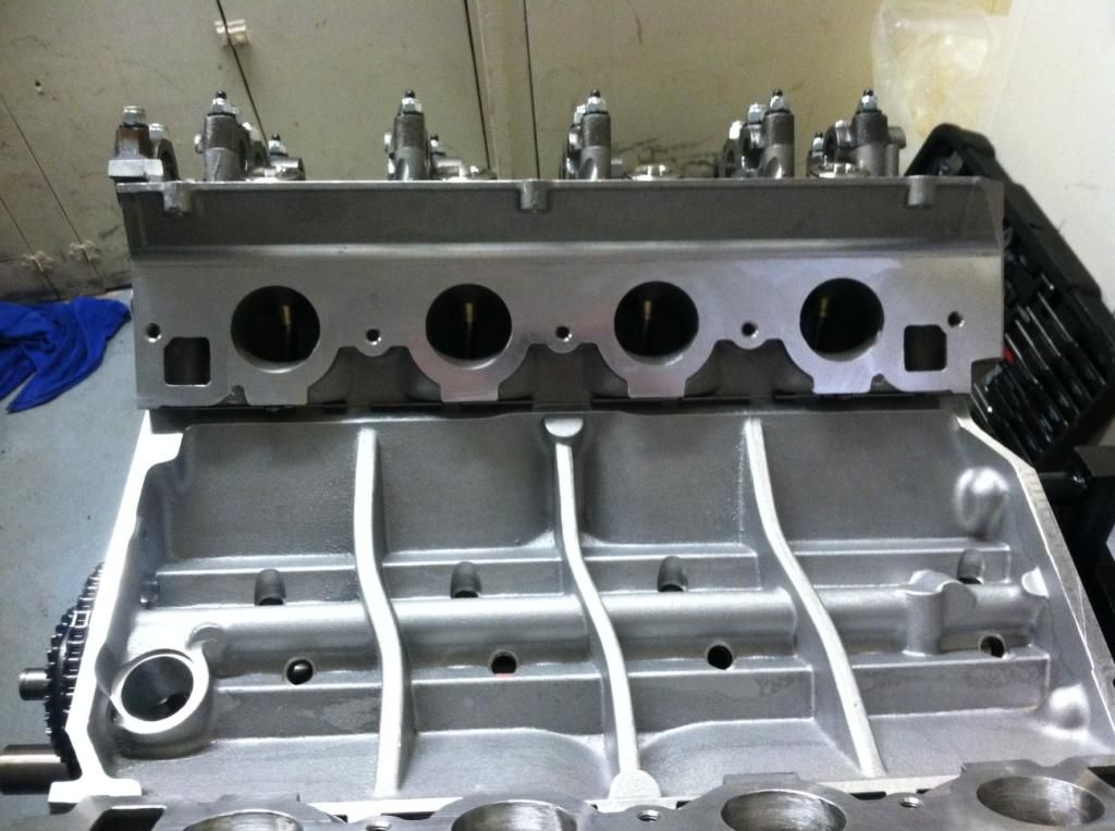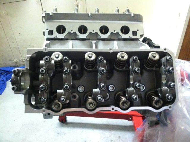 With this, I wanted to be sure of a solid seal, so I laid the small gaskets out that go on each head, the 2 gaskets that go where the water pump goes, and the gasket that goes around the timing chain.  After matching them up to their place for installlation (which side needs sealant), I put a bead all the way around the gaskets and used my finger to basically coat the entire gasket with a layer.  I figured this would be safer than putting a small bead all the way around.  I stuck them to the front of the block and heads, and then coated the fronts of the gaskets in the same manner.  once this was done, I sandwiched them with the backing plate.  Much like Jay said during his built, getting the bolts ready so you have all the right bolts ready to hold the backing plate tight against the gaskets was key.  once I had them all tightened up, I took my finger and cleaned all the areas where the sealant squished out.  Before I finished for the night, I remembered that the bolt next to the bottom bolt on the passenger side water pump needed to be coated with sealant and sealant under the washer and alll around it (because it goes into the water jacket).  I am going to be setting the timing and then taking the cover plate back off, so I will not be installing the second set of gaskets until after the timing is set.  See below pictures!  FINALLY starting to look like a Cammer engine@!  Not sure if you can see it on these pictures, but when I had the heads done up at Keith Craft, he did a slight port job for me.  Smoothed out the intake ports "casting texture" for better air flow.