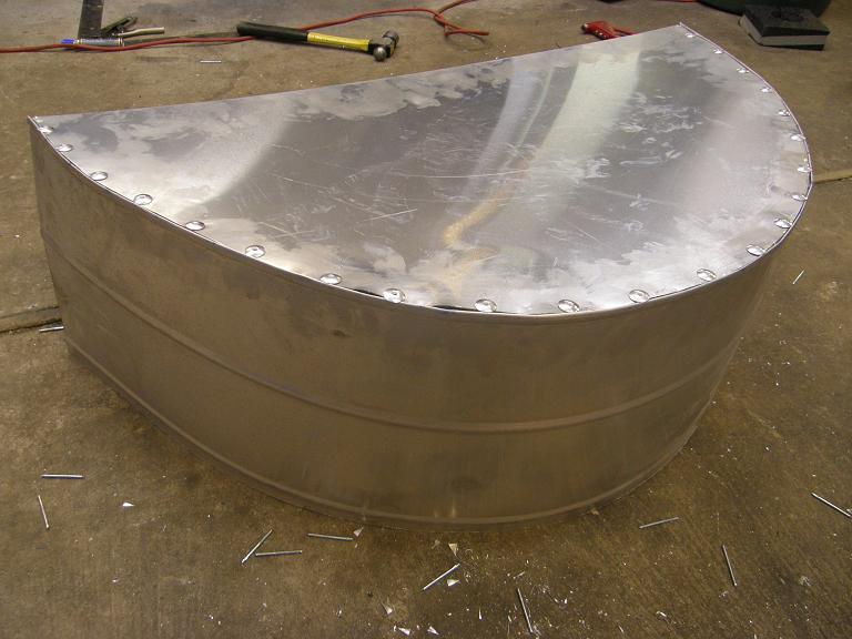 Unfortunately, this didn't work out because I couldn't easily get the side of the half moon piece bent over in a smooth curve. As soon as I got to a point where the curve wasn't smooth, the bent part didn't want to slide into the groove in the flat part. After several attempts at rebending, with limited success, I decided to go to a different approach. I bent the grooved portion of the flat part out at a 90 degree angle, and used pop rivets to put the two pieces together. Here's a couple of photos showing this process: