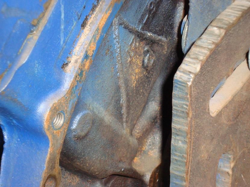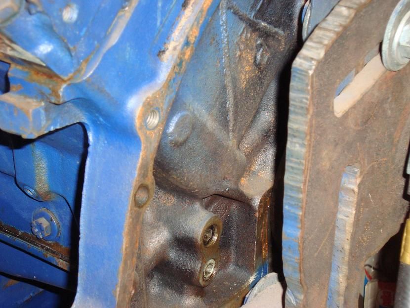 In this photo you can see the "hump" in the side of the block for the side-oiler passage an inch or so above the oil pan. There are 3 small threaded plugs there right above the cross bolts.