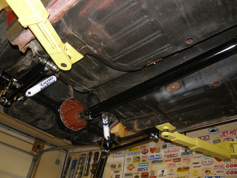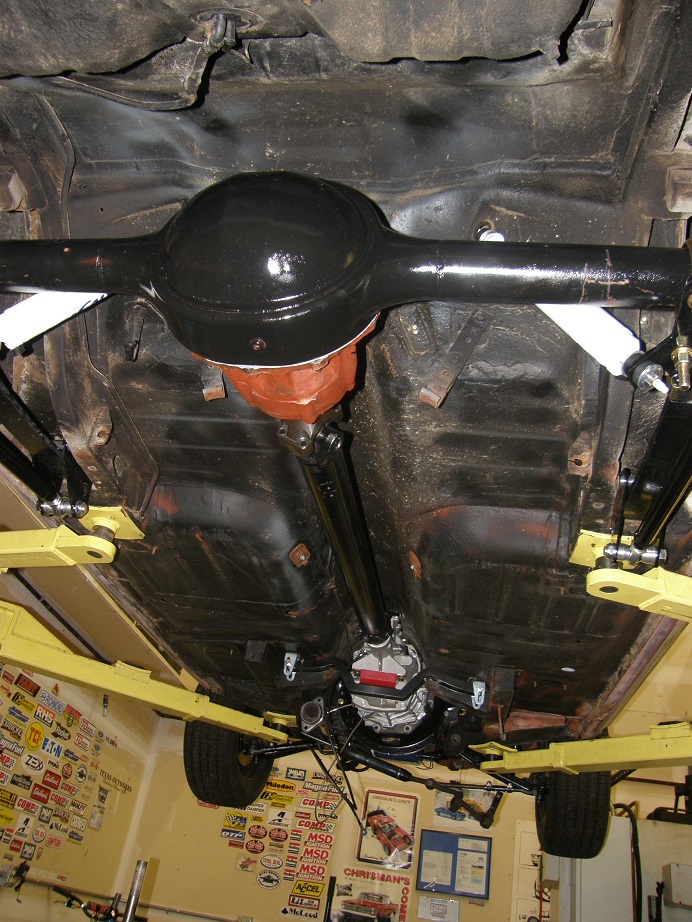 Then after a clean up of the sealing surfaces and digging around to find the 9" housing gasket (My last one!  Better order more...), I installed the pumpkin and tightened up the bolts.  I even found a spare set of copper washers to go on the axle housing studs.  Also bolted the shocks into place at this point.  And, as luck would have it, my driveshaft from American Powertrain arrived today.  I always worry about the fit of the driveshaft, but the big moment came, and it slid right into the trans and up into the rear end yoke with no issues.  Looks just about perfect for length.  Here's a couple pics from under the car:
