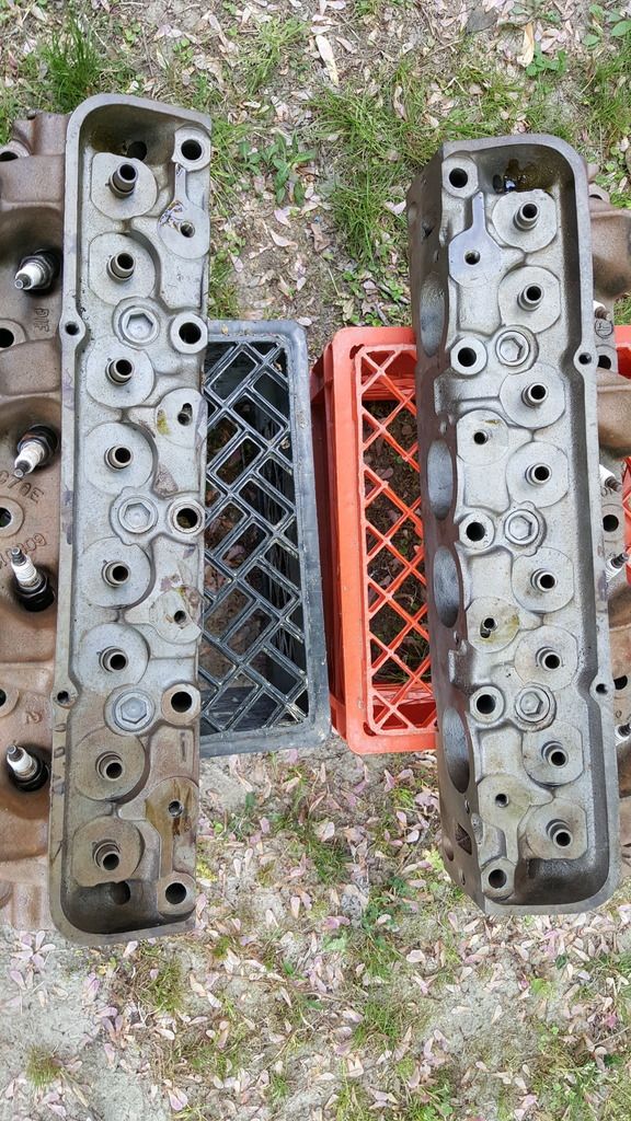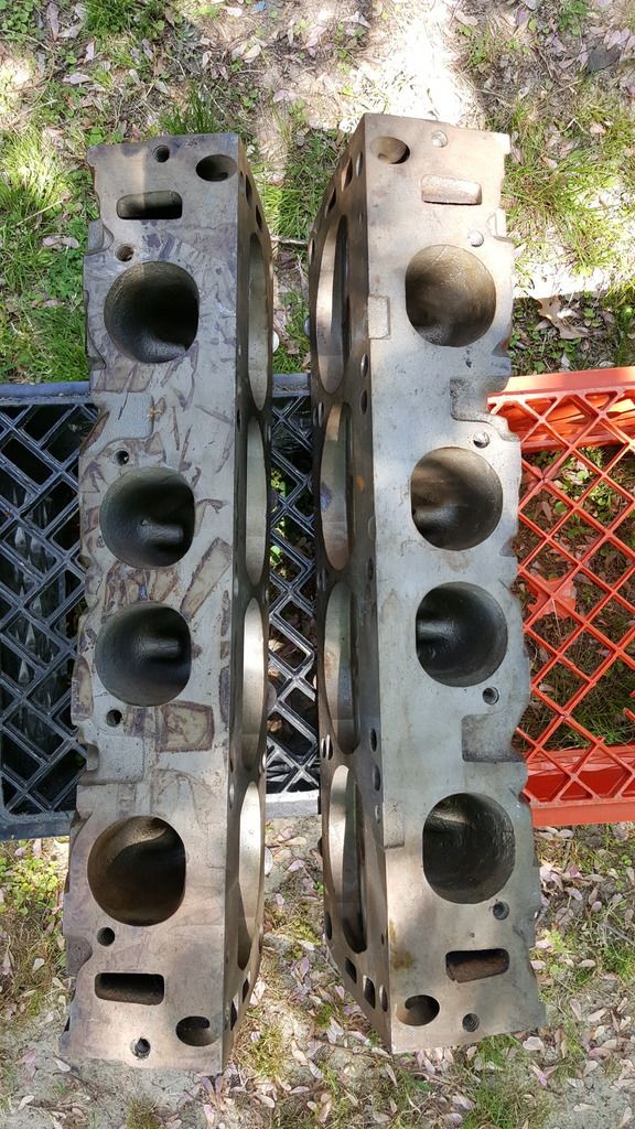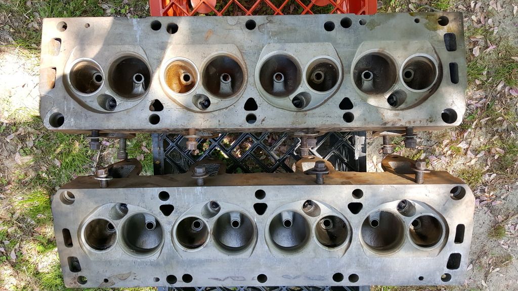 I see the one head has the common welded up area between the spark plug hole and the intake seat.  Very common to see the tunnel port heads crack there.  Fortunately there's no water there; I've heard of people running them cracked for long periods...