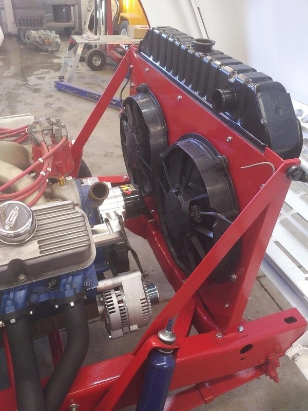 I finally got some time off from work. While I was away, dad has been busy. He put the front clip back on along with the radiator and built a cool little shroud with a couple of cooling fans. The fans came from a mid 90's Taurus. Hopefully they move plenty of air.