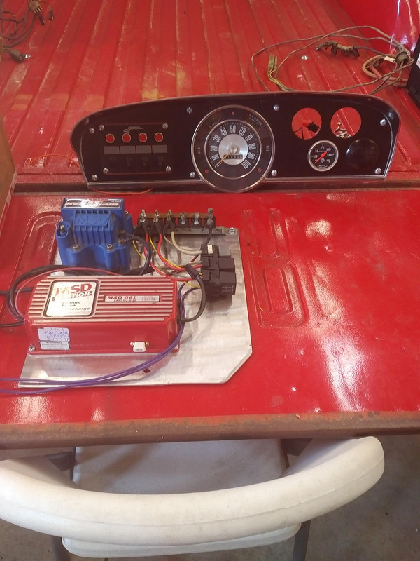 Dad assembled a slick little panel for the ignition components with breakers and relays for fans, water pump and fuel pump. He pulled the breakers and relays out of an old Freightliner in his boneyard. Dads ability to make chicken salad out of chicken shit always surprises me.  I took some 18ga plate and made inserts for the stock instrument panel so we could mount switches and gauges.