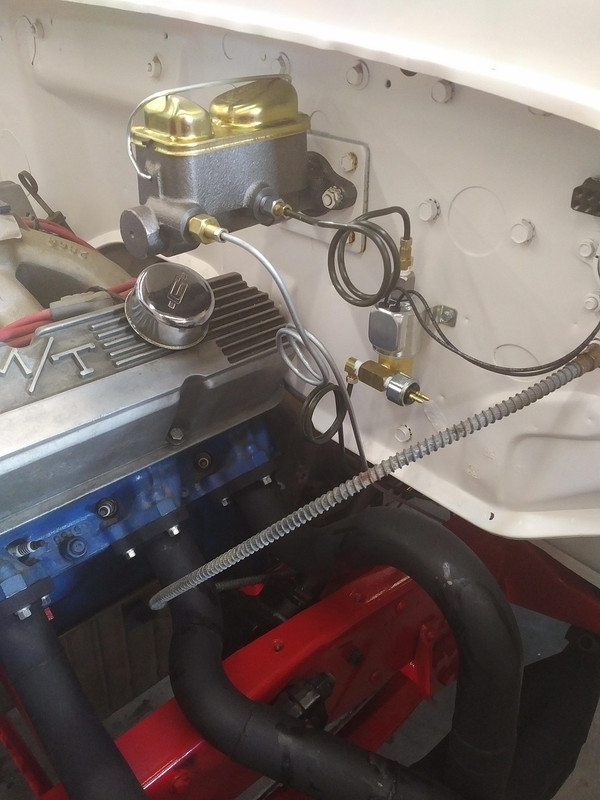 We have a working brake system now too. We finished running all new steel brake lines last weekend and vacuum bled the system. We also upgraded to a double sided master cylinder for a bit more safety. The factory emergency brake system works too. We couldn't wait to geek out with the line lock valve so we wired it temporarily to a jumper box. It works great!