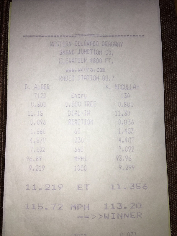 I've never ET raced before. The Friday night races use a even starting tree. So getting used to seeing a car launch a second before me is really difficult with a ET tree. I have to constantly remember to just race the red truck. Lol And be consistent. I won the first round race just barely against a 69' Olds 442. Nice car. I posted the time slip from that race below. I ended up losing in the second round to last years Pro ET class champion. He ran a 9.35 on a 9.34 dial in. Hard to compete with that.