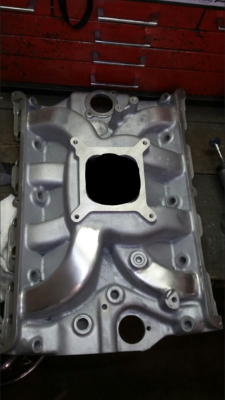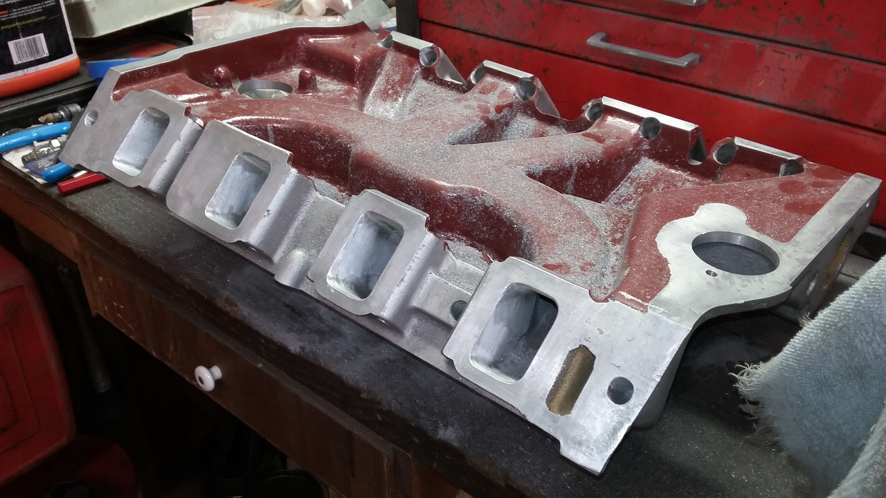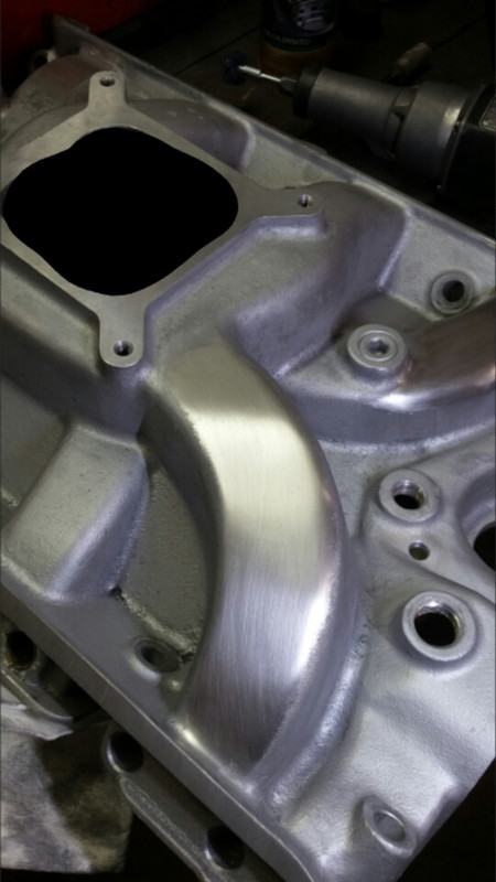 This step was obviously performed before the last post. Intake got some work. Pushrod holes opened and elongated. Port matching to heads and plenum modification. Plenum mods are covered, sorry. Also removed all Edelbrock logos, part#, and casting lumps on top of ports.