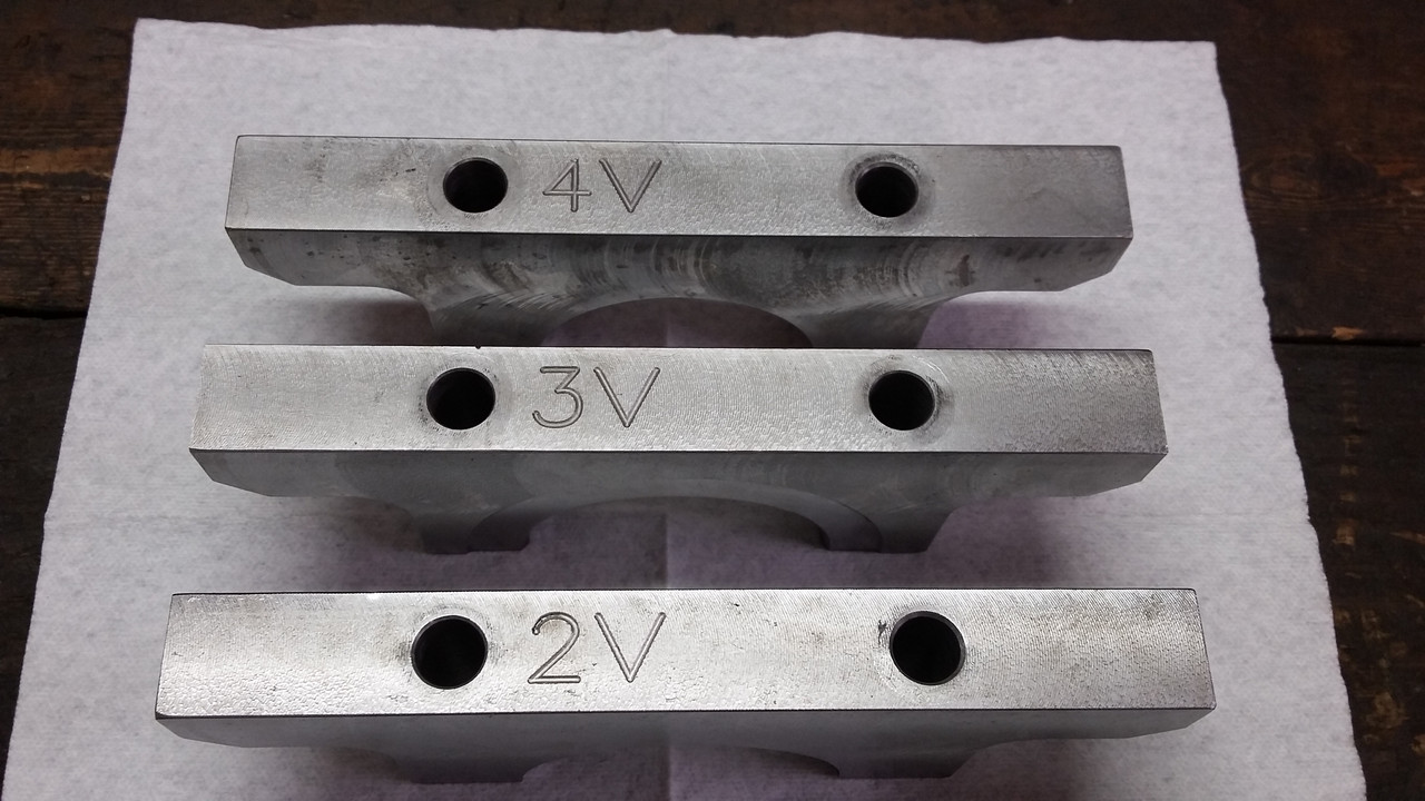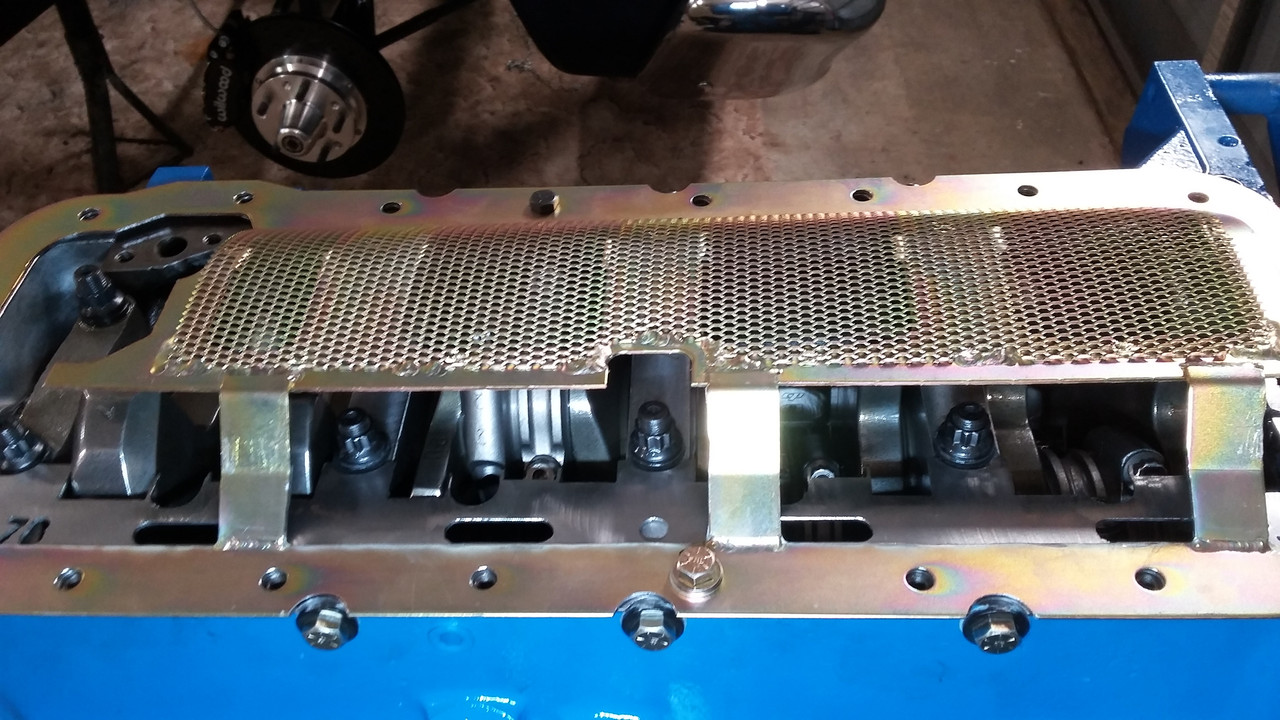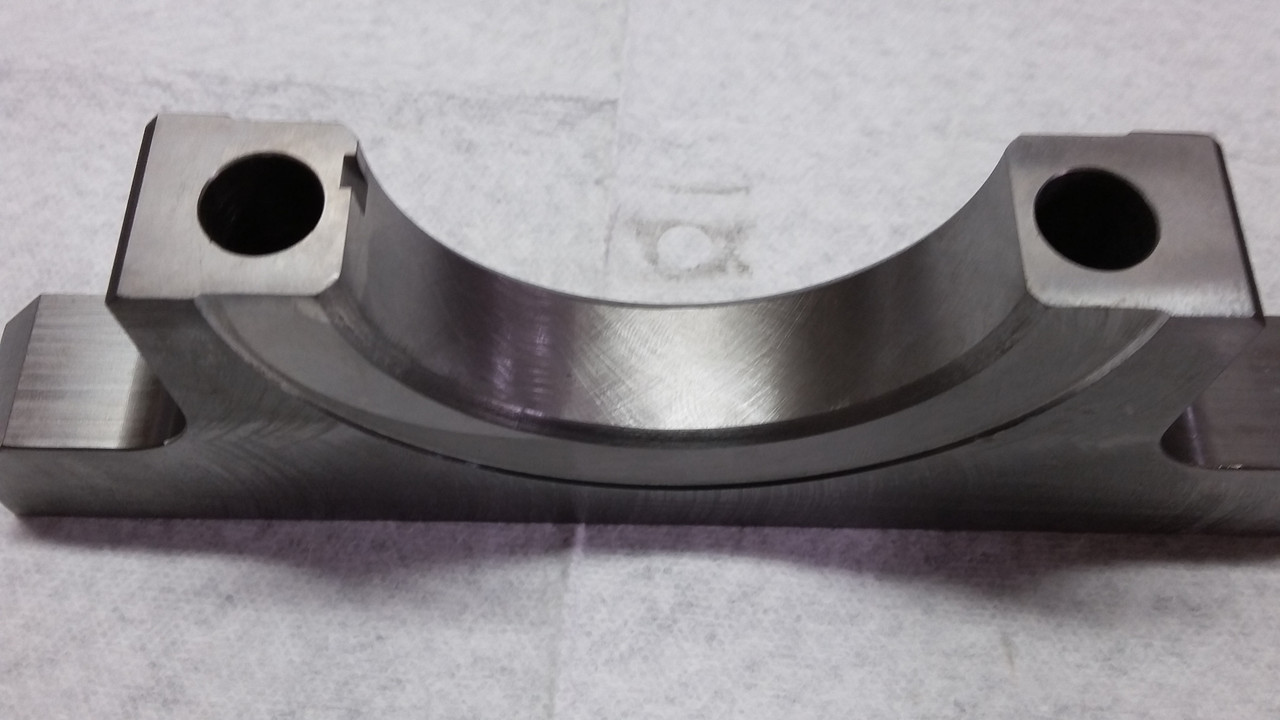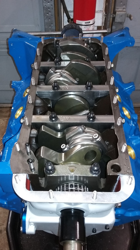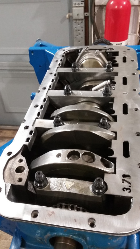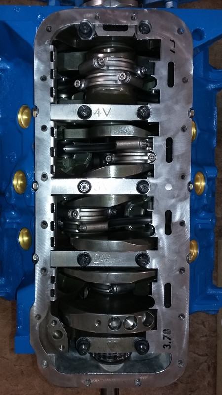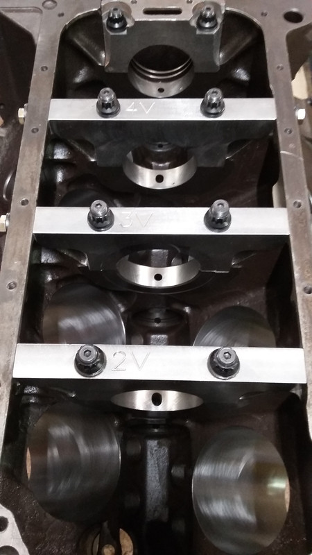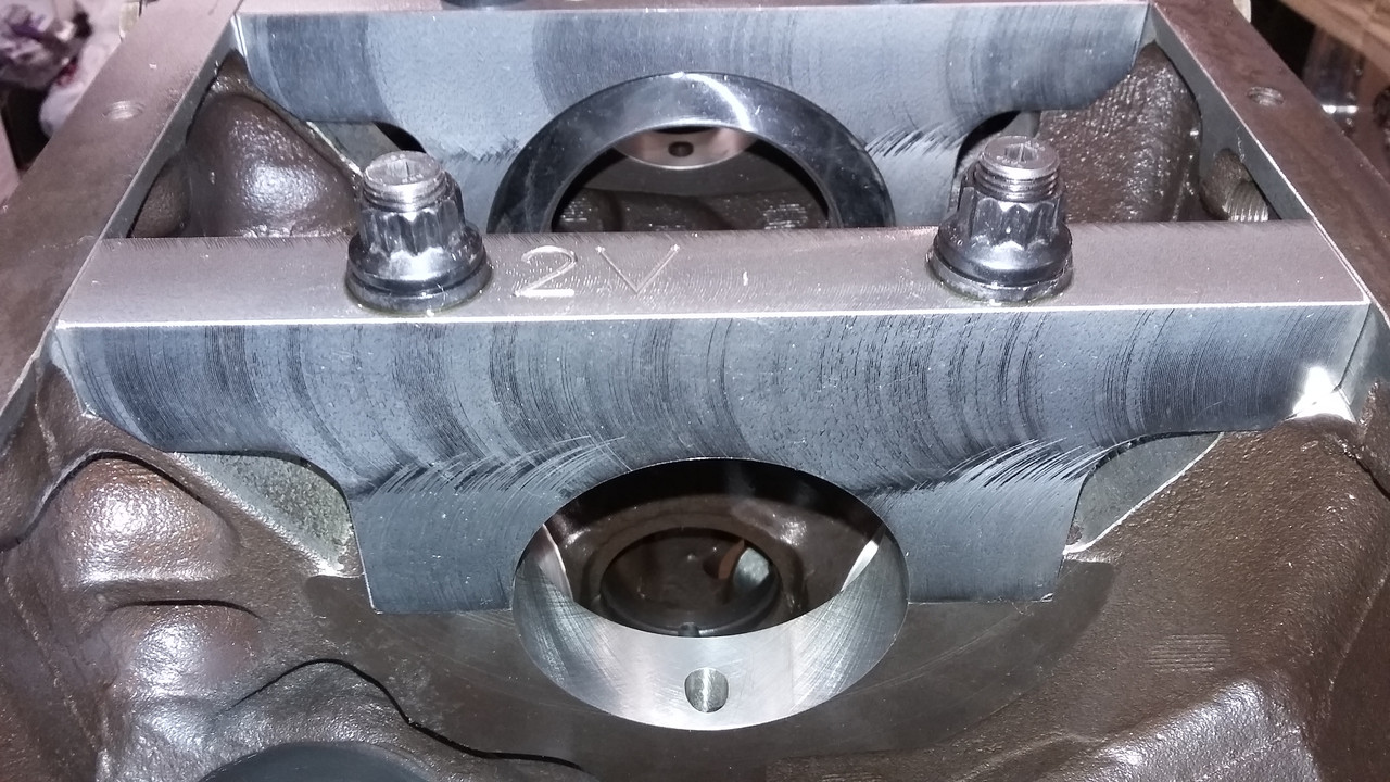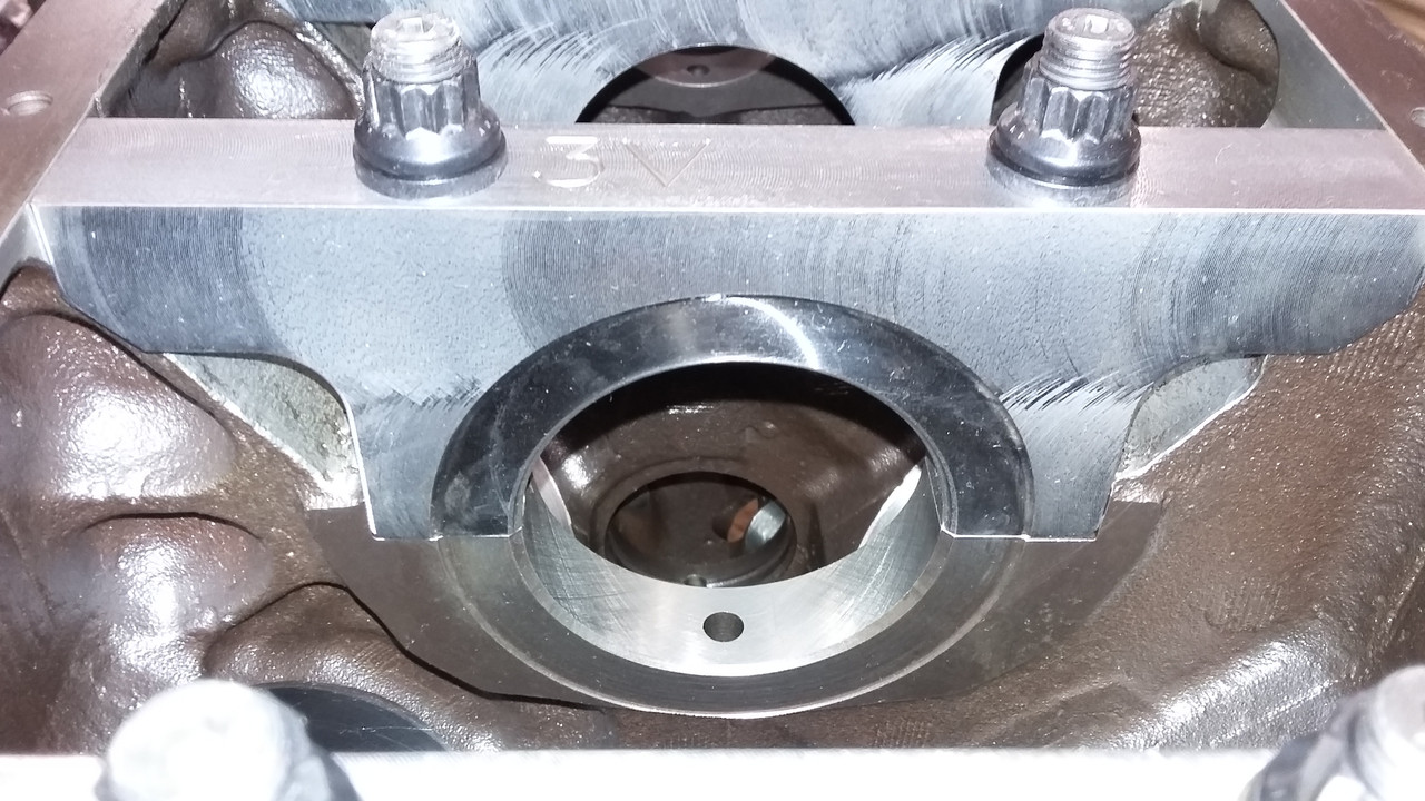 Starting with the mirror 105 block, it was cleaned and magged. Extensive oil mods throughout. Went to a local machinist who made some nice custom cross bolt main caps. I told him what I was looking for and he delivered. 4140 steel caps with 2-2 1/2 thou press on each side into block skirt. I told him keep them close to pan rail to not cut as much from the main webbing.