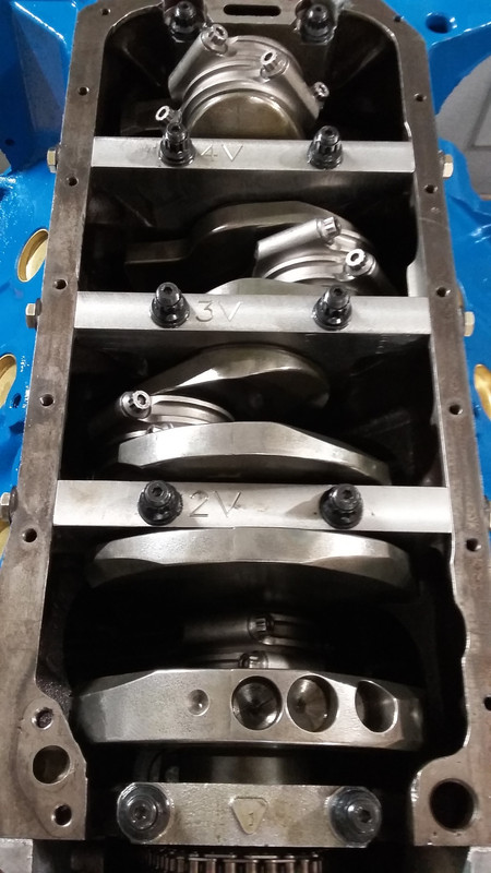 Block needed four sleeves, two on each bank. No sleeves were adjacent cylinders, luckily. I unshrouded for the big valves. Block decked and left pistons .003" down. Crank was still at stock journal size. Crank was cleaned, magged, shot peened, ground, and polished. I ordered 10 under bearings for mains and rods and had clearances set. Crank also got some special treatment after it left the machine shop.