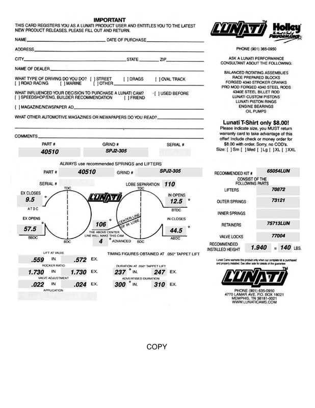 In my reply, regarding duration, I did mead MORE, standard flat tappet duration. 6200 rpm isn't where that TP needs to be, the only way to increase the rpm, is with duration on the early cam lobes. The high flowing TP ports, weren't created for a low rpm engine and streetability was not their purpose, at all! They were a race head and that's how they need to be used. With a cam that peaks at 7000. I always wanted a set of SB TP's but, never found a set for sale.