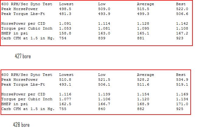 I'd say years ago a 427 basically picked up where a 428 left off. A low riser head either be about the same. Want more power be a MR, HR, or TP head which requires the bigger bore of a 427. Today with good aftermarket heads can make the power that used to require a 427 with the good factory heads, actually many time even more, but not need the large bore.