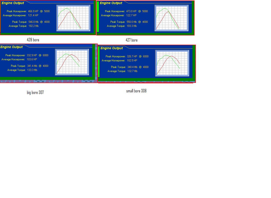 Plugging no changes except for the bore and stroke Frank had, I got the that chart.  Is it accurate?  Who knows, but it does show what I suspect real world would show, ever so slight advantage to a bigger bore for breathing, but not really enough to make a wild difference
