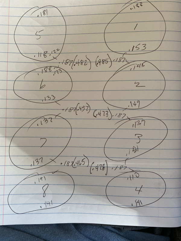 These are center of the barrel measurements. I took measurements then filed the head to fit the cylinder arc and measured again. The measurements got smaller and more stable. I then used the 3/16 drill bit size (.1875) that I was able to fit between the cylinders to add to the adjoining cylinder walls and you see the end measurements in the middle.